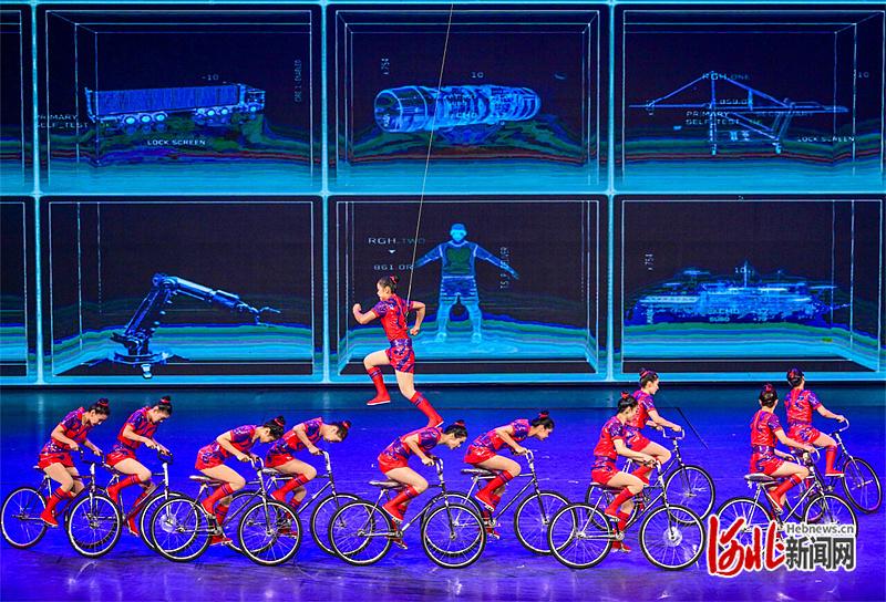 9月28日,河北省杂技团演员正在吴桥江湖大剧院表演《雏凤凌空—— 女子集体车技》。 河北日报记者 李东宇摄
